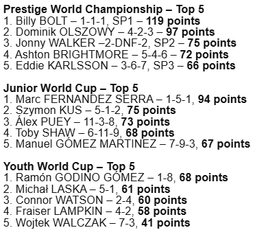 En Juveniles, Ramón Godino Gómez se quedó fuera del podio, pero mantuvo su posición de líder de la categoría. La victoria de Michał Laska ha reducido la diferencia con la punta. Fraiser Lampkin terminó segundo y Connor Watson tercero.
