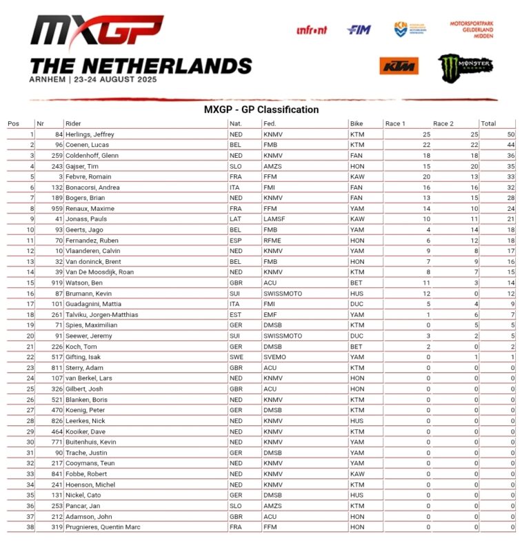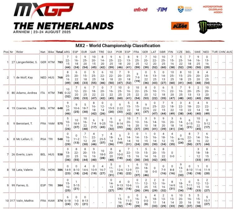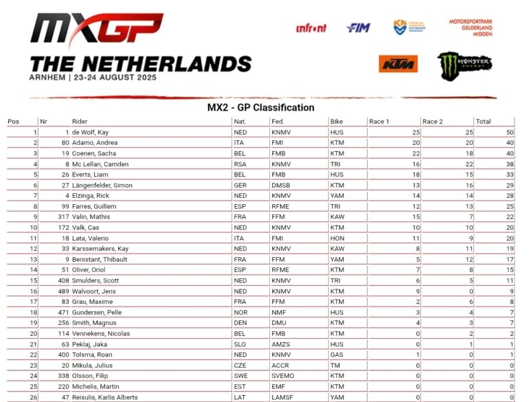 Por su parte, la categoría MX2 también tuvo su propio protagonista neerlandés, con una actuación de ensueño por parte de Kay de Wolf (Husqvarna). De Wolf, al igual que su compatriota en MXGP, logró una barrida perfecta, sumando la máxima cantidad de puntos en su primer Grand Prix ganado en casa. Este triunfo consolida su posición en la cima del campeonato, aunque la lucha por el título sigue siendo una contienda de tres vías con los talentosos Simon Längenfelder (GasGas) y Andrea Adamo (KTM), quienes no darán tregua hasta el final. El alemán, por ahora resiste.