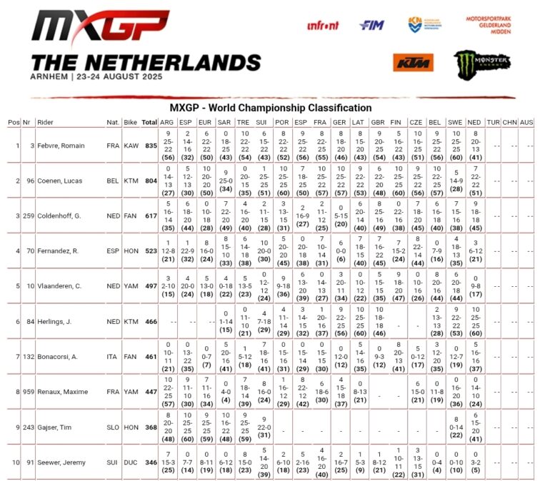 La competencia, sin embargo, estuvo cargada de intensidad y batallas por los puestos de honor. La lucha por el podio fue reñida, con el belga Lucas Coenen (Husqvarna) exhibiendo una impresionante remontada en ambas carreras para asegurar un merecido segundo lugar en el podio general. A su vez, el también neerlandés Glenn Coldenhoff (Fantic) logró su primer podio en casa desde 2016, completando un día de ensueño para los anfitriones. A pesar del resultado, la pelea por el título mundial sigue candente, con Romain Febvre (Kawasaki) y Coenen manteniendo una reñida disputa en la clasificación general, lo que promete un final de temporada de alta tensión.