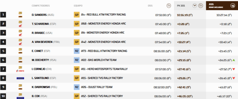 Iniciando y finalizando de nuevo en Erfoud, los más de 300 kilómetros de acción fueron muy intensos con Schareina abriendo ruta pero ganando a la vez, en un rendimiento espectacular. Con su Honda, aceleró a pleno, fue perseguido de cerca por Sanders, y solo se redujo en cinco segundos la diferencia, que ahora es de 38 segundos. Tercero fue Ricky Brabec (Honda), quien ve como no puede contra su compañero en la batalla por el subcampeonato.