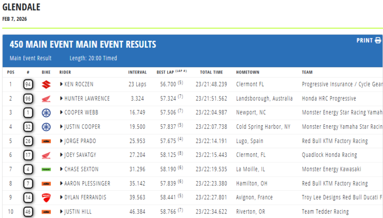 Ken Roczen (Suzuki) se llevó la victoria en Glendale y se convirtió en el cuarto ganador distinto en las primeras cinco fechas del AMA Supercross 2026 en la Clase 450. El alemán tomó el control de la final tras superar a Hunter Lawrence (Honda) y administró una ventaja sólida hasta la bandera a cuadros. Su triunfo también marcó su quinta conquista dentro del State Farm Stadium.