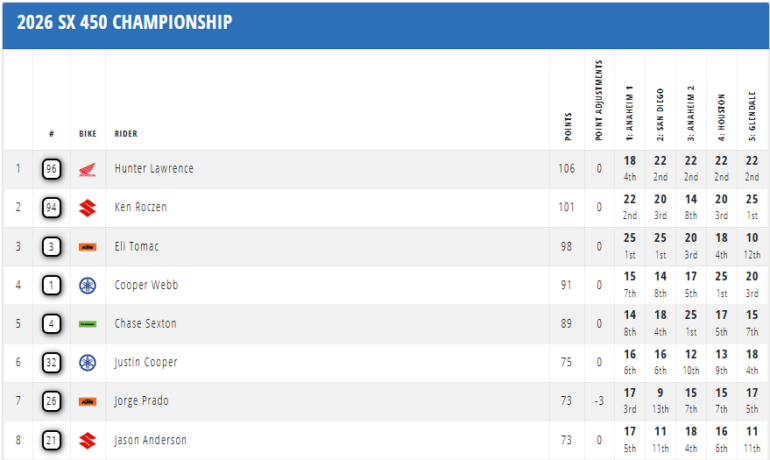 Con este resultado, Lawrence encabeza el campeonato con cinco puntos de ventaja sobre Roczen, mientras que Tomac cae al tercer lugar. La temporada sigue mostrando una notable paridad en la categoría reina, con múltiples protagonistas capaces de ganar.