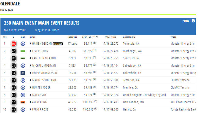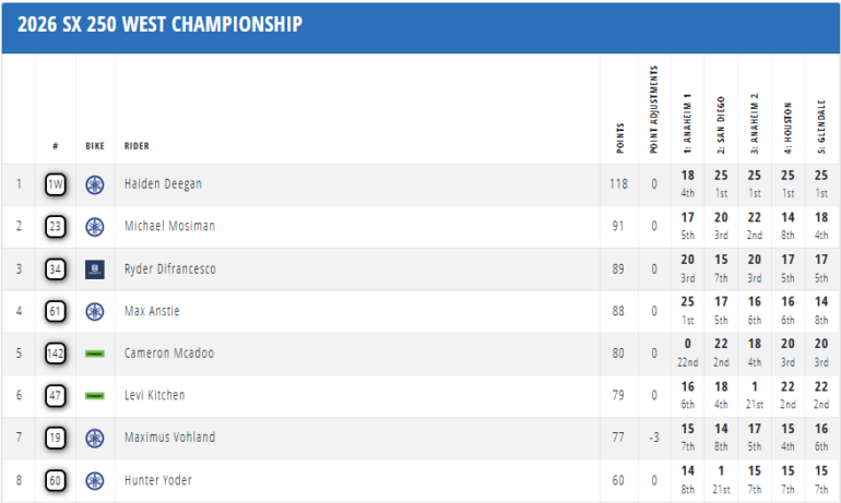 Con este nuevo triunfo, Deegan amplía su ventaja en el campeonato y ya cuenta con más de una carrera de margen sobre sus perseguidores. Kitchen y McAdoo se consolidan como sus principales amenazas en una categoría que mostró un ritmo frenético en Glendale.