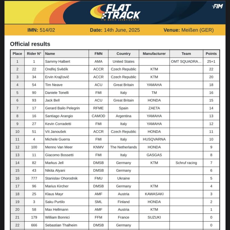 La 2ª Fecha del Mundial de Flat Track (6ª Edición) se corrió en el Circuito de Meissen (Meiben), Alemania. La victoria general fue para el actual campeón del mundo Sammy Halbert. El norteamericano venía de un inicio en P5 y con complicaciones que también se les presentó en el primer Heat alemán. Sin embargo, Sammy sacó a relucir su profesionalismo y terminó imponiéndose.