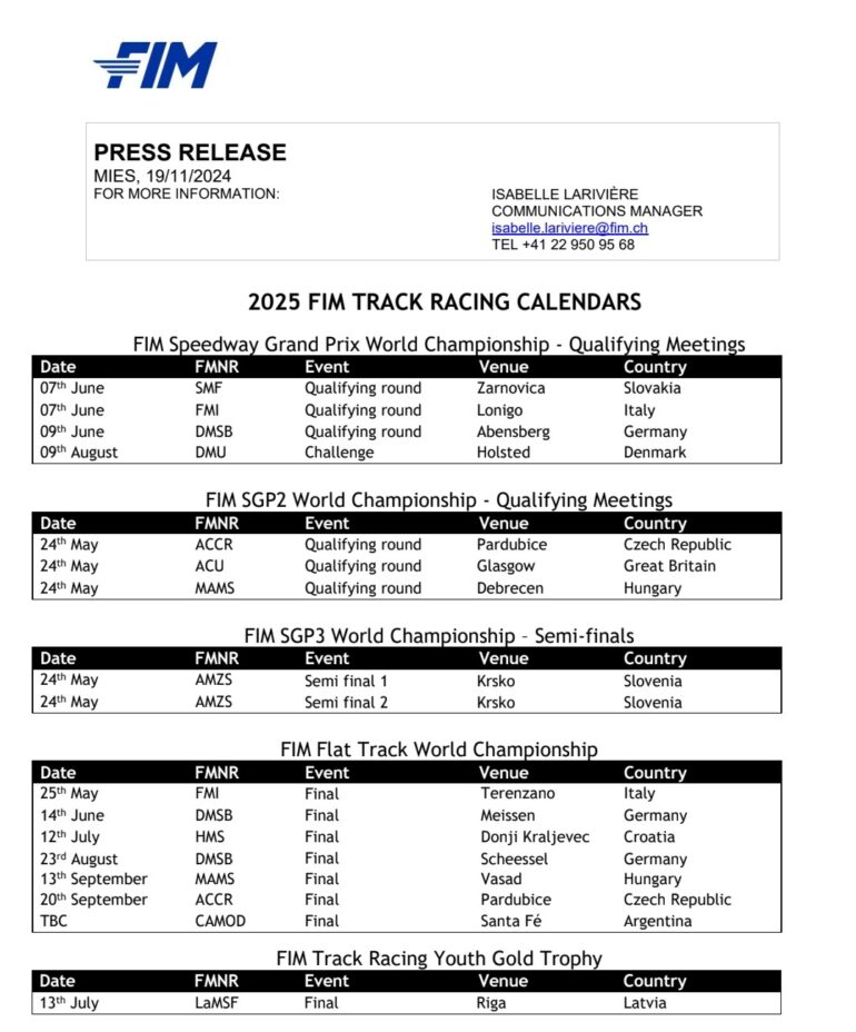 Este martes 19 de noviembre se develó el Calendario 2025 del 7° Mundial FIM World Championship Flat Track. Argentina, la provincia de Santa Fe, figura dentro del cronograma de carreras con fecha a confirmar.