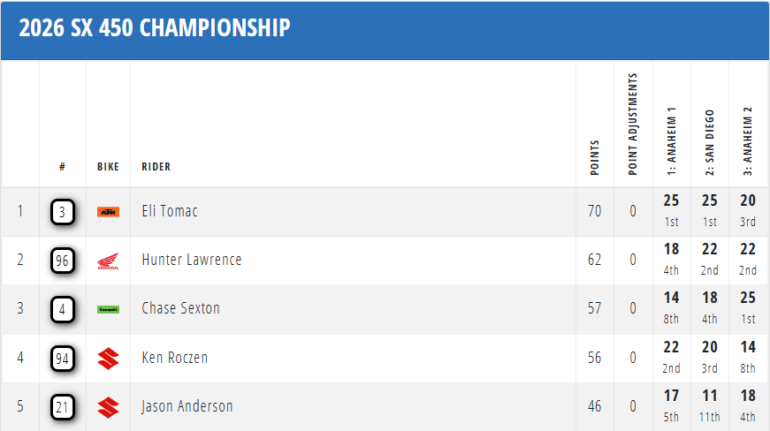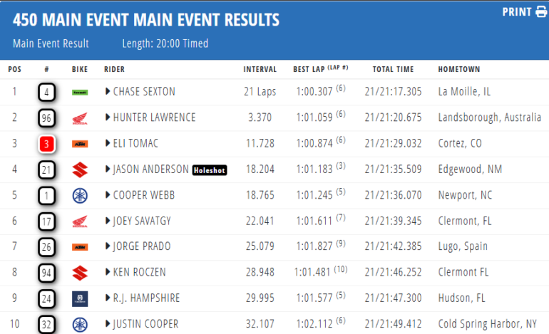 Sexton se llevó así su 17ª victoria profesional con 3.3 segundos de margen, mientras Tomac mantuvo su pleno de podios y lidera el campeonato con ocho puntos sobre Lawrence. El australiano asciende al segundo puesto tras dos segundos consecutivos, y Sexton se coloca tercero a 13 unidades. Ken Roczen (Suzuki), en cambio, cayó al cuarto lugar tras una remontada desde el 21º hasta el octavo puesto.