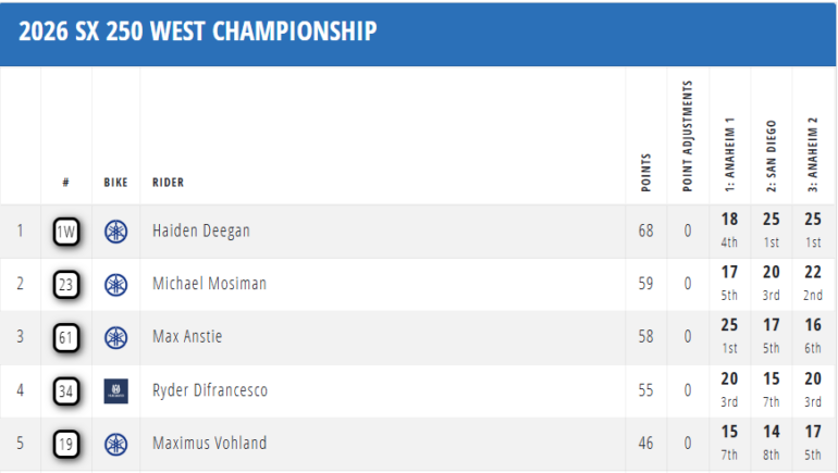 Deegan firmó así su novena victoria profesional, con 8.5 segundos de margen sobre Mosiman, que suma un tercero y un segundo en las últimas dos rondas. Ryder DiFrancesco (Husqvarna) completó el podio tras imponerse a Cameron McAdoo (Kawasaki) en una intensa batalla. En el campeonato, Deegan lidera con nueve puntos sobre Mosiman, mientras que Max Anstie (Yamaha) cae del segundo al tercer puesto tras finalizar sexto en su actuación más discreta del año.