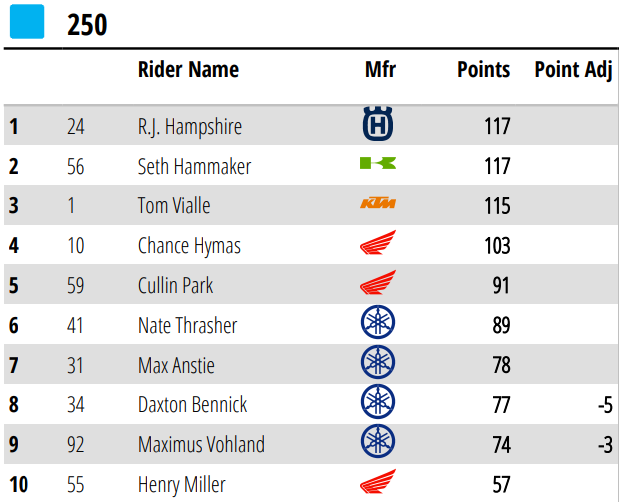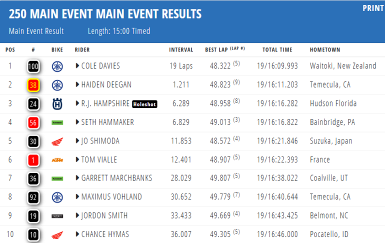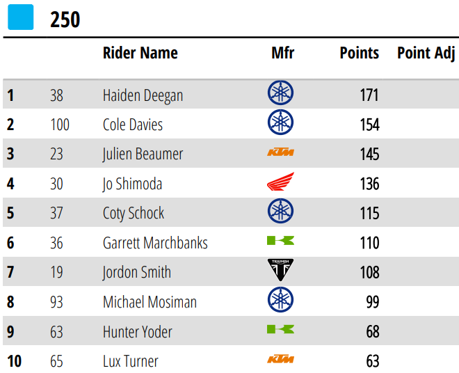 Por otro lado, la Clase 250 reunión a los pilotos de ambas divisiones, y el ganador fue el neozelandés Cole Davies (Yamaha), representante del Oeste, en el segundo evento conjunto de este año. Haiden Deegan (Yamaha) quedó segundo y sigue cómodo líder de la división occidental. Mientras que RJ Hampshire (Husqvarna), fue tercero y amplió distancias en el campeonato Este. La carrera tuvo una bandera roja por una dura caída de Daxton Bennick.