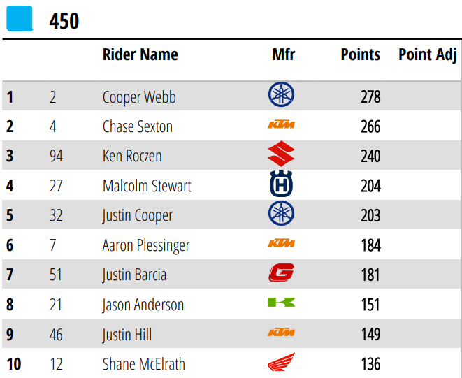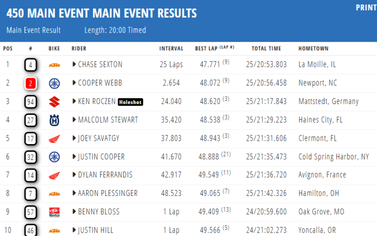 Cooper Webb (Yamaha) también se complicó en la primera curva como tantos otros, pero se recuperó y pudo lograr ser segundo, para mantenerse líder del certamen con doce puntos sobre Sexton. n tanto que Ken Roczen (Suzuki), fue líder buena parte de la carrera con holeshot incluido, y poco importó la lesión grave que lleva en el tobillo; el alemán fue tercero y sigue dando que hablar con la Suzuki.