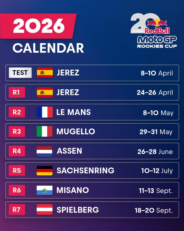 El Campeonato Red Bull MotoGP Rookies Cup corre del 24 al 26 de abril en Jerez de la Frontera, Andalucía, España; las primeras dos competencias de la 1ª Fecha de la Temporada 2026 que significará la Edición 20 de la historia.