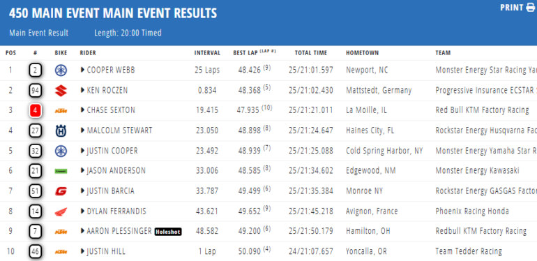 La prueba final tuvo a Ken Roczen saltar a la vanguardia en la primera vuelta y lideró el grupo durante la mayor parte de la carrera principal, de 20 minutos más una vuelta. Defendió varios ataques de Webb durante la carrera, pero cedió el primer puesto en los minutos finales, perdiendo una buena chance de victoria.