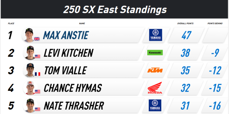 En Clase 250 Este, Levi Kitchen (Kawasaki) contuvo a Max Anstie (Yamaha) y fue quien festejó en esta oportunidad. El tercer lugar del podio tuvo una ajustada definición entre RJ Hampshire (Husqvarna) y Tom Vialle (KTM), pero fue para el de la Husky. Anstie domina la tabla seguido por Kitchen y Vialle en el tercero de adelante.