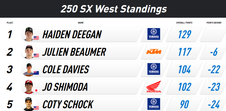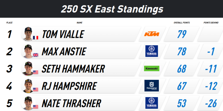 Por su parte, la división 250 tuvo el primero de los tres enfrentamientos Este/Oeste en la temporada 2025. Seth Hammaker (Kawasaki) se ganó el holeshot y lideró cada vuelta para convertirse en el octavo ganador en nueve rondas de competencia de 250. Esta fue la segunda victoria de su carrera. Hammaker tuvo presión de Tom Vialle (KTM) en las últimas vueltas, pero mantuvo la compostura para ampliar su ventaja a cinco segundos en la meta. Haiden Deegan (Yamaha) se fue a través de la red de seguridad pero volvió para completar el podio.