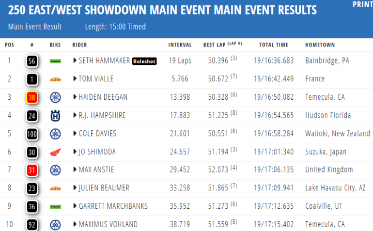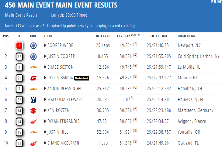 Webb logró una sólida ventaja en las primeras 12 vueltas y la amplió en la segunda mitad de la carrera después de que Chase Sexton (KTM) cayera mientras marchaba segundo. Webb vio el banderazo con ocho segundos sobre su compañero de equipo Justin Cooper (Yamaha).