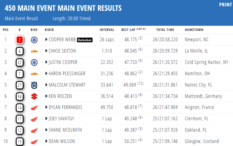 Con cinco victorias cada uno en la Clase 450, Webb y Sexton son los dos que han podido permanecer a lo largo del torneo bien enteros y están luchando por llevarse la corona. Faltan dos pruebas y todo puede acontecer, con una diferencia de doce puntos que no deja nada servido a Cooper, pero tampoco será tarea sencilla para Chase.