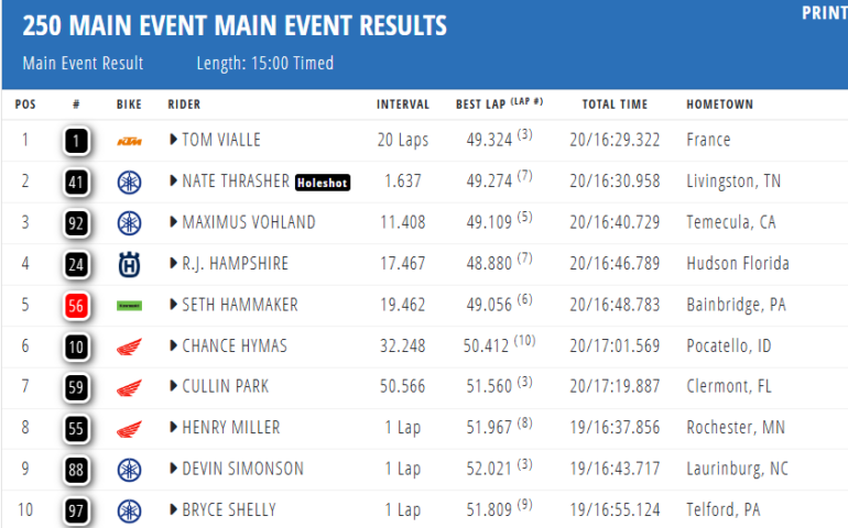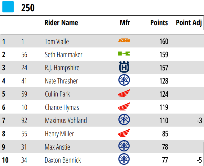 En la Clase 250 Este, volvió a la senda victoriosa Tom Vialle (KTM) y saltó de nuevo a la punta del campeonato, derrotando a un Nate Thrasher (Yamaha) muy inspirado. Vialle vio al #41 tomar el Holeshot, pero atacó y le arrebató la gloria. La placa roja pasó de manos, y de Seth Hammaker (Kawasaki) volvió a Vialle, quien le lleva un punto a quien quedó quinto esta vez, y tres a RJ Hampshire (Husqvarna).