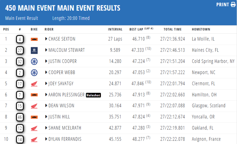 En la partida, Webb tomó la punta pero luego cayó al cuarto lugar y supo que necesitaba tener poder de reacción en caso de que se compliquen las cosas, y se mantuvo tranquilo, evitando riesgos para que los nueve puntos de distancia con Sexton sean totalmente inalcanzables. Sexton sabía las cosas, pero corrió con soltura e hizo su trabajo, y como al final del día solo uno puede ganar el título, esta vez quedó para el de Yamaha, quien fue más consistente. Cooper ganó cinco competencias, Chase siete, y las caras se seguirán viendo en el AMA Motocross, para continuar con la temporada de SuperMotocross.