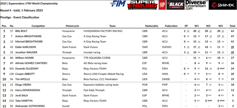 Una nueva cita polaca traspasó la mitad de calendario del SuperEnduro, donde Billy Bolt volvió a ganar con su Husqvarna y avanza hacia otro campeonato de la especialidad. La tres competencias en Lodz fueron ganadas por el vigente campeón y no hubo nada que hacer.