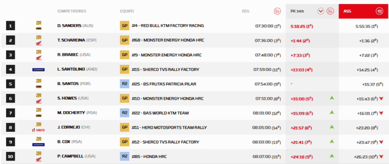 Sanders se mantuvo imperturbable durante las primeras etapas, y ahora resiste a las Honda, ayer a Adrien Van Beveren, pero desde hoy, a Tosha Schareina (Honda) y a Ricky Brabec (Honda). Lorenzo Santolino (Sherco) es cuarto. El australiano, viendo que al argentino no le están saliendo bien las cosas, podría consagrarse campeón en este evento, el cuarto de cinco.