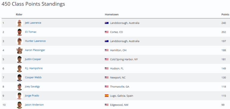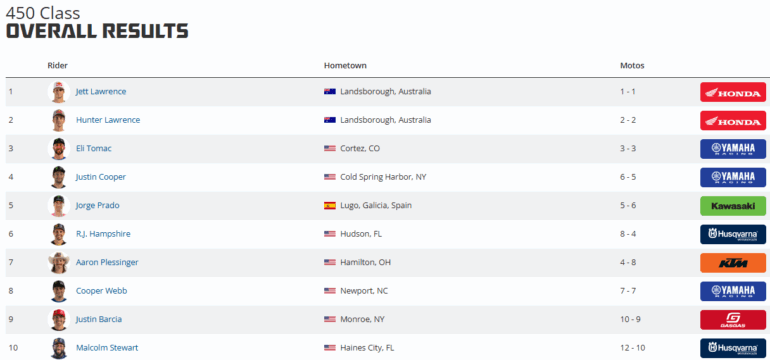 El podio de la 450 fue completado por su hermano y compañero de equipo, Hunter Lawrence (Honda), quien obtuvo un sólido segundo lugar general con resultados de 2-2, marcando su segundo subcampeonato consecutivo. Eli Tomac (Yamaha) se llevó el tercer puesto con un 3-3, logrando su cuarto podio en cinco carreras. Con estos resultados, Jett Lawrence amplía su liderazgo en el campeonato a 38 puntos sobre Tomac, consolidando su posición como el hombre a batir.
