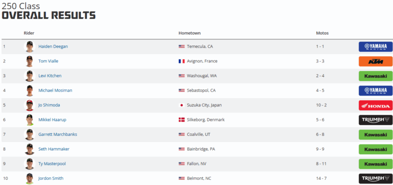 Por su parte, en la Clase 250, Haiden Deegan (Yamaha) no se quedó atrás, también logrando una barrida perfecta de 1-1. Esta victoria representa su cuarto triunfo de la temporada y su cuarto 1-1, destacando su consistencia y velocidad. Deegan hizo historia al convertirse en el primer ganador consecutivo en Southwick en la categoría 250 desde 2011, un testimonio de su destreza en esta pista.