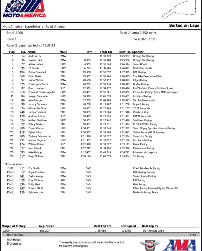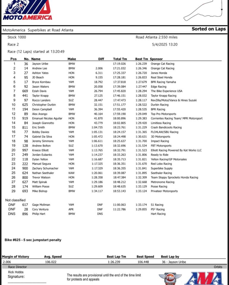 El Circuito del Road Atlanta de 4.103 metros fue escenario de la Fecha 2 general del MotoAmérica y que abrió el campeonato de la divisional Stock. Emanuel Nicolás Aguilar del Corrientes Racing Team/ MPR Motorsport, logró P10 también en la Qualy del viernes.