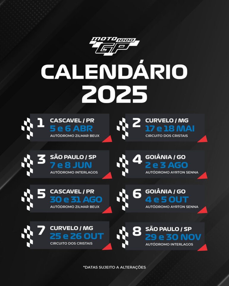 Tras la fecha Coronación en San Pablo, la organización del Campeonato de Motovelocidade de Brasil Moto1000GP ya anunció las 8 fechas y los 4 circuitos donde se correrá la Temporada 2025. Durante la Temporada 2024 participaron 4 pilotos argentinos: Ramiro Gandola, Agustín Donatti y Mauro Passarino en la Categoría Superbike 1000 y Facundo Medina en la Categoría GP300.