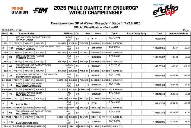 La cuarta ronda del Campeonato Mundial FIM EnduroGP arrancó en Gales con Josep García (KTM) imponiéndose con autoridad. Ya había ganado el Súper Test, y triunfando en los primeros tramos difíciles, se consolidó. Además, Andrea Verona (GASGAS), como escolta no aguantó y se vio superado por Zachary Pichon (TM), para definir el podio.