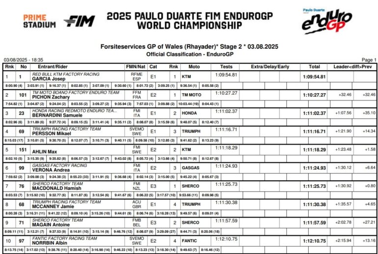 En la segunda etapa, la carrera tuvo piso diverso con el clima cambiante británico, y la batalla se estableció entre García y Pichon, con el francés muy inspirado en la búsqueda de la victoria. Pero el español se equivocó menos, y Pichon erró en el final, perdiendo 27 segundos en la anteúltima especial. Fue doblete para García y segundo podio en EnduroGP para Samuele Bernardini (Honda), quien quedó tercero detrás de Zach Pichon.