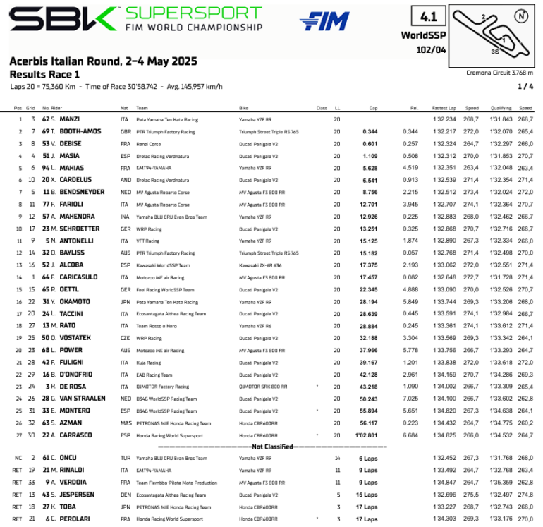 El italiano Stefano Manzi sigue liderando el Mundial de Supersport. Después de varios podios sin victorias, se impuso en su país, en el circuito de Cremona, y comenzó a estirar los puntos en la general. Manzi ganó las dos finales del fin de semana.