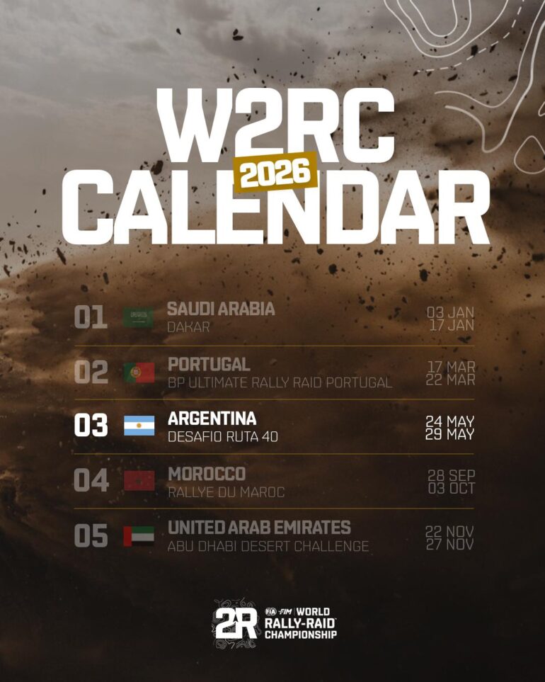 El Campeonato Mundial de Rally Raid (W2RC) confirmó el calendario 2026 con el regreso estelar del Desafío Ruta 40. La fecha argentina se disputará del 24 al 29 de mayo, marcando así su retorno al escenario internacional tras un año de ausencia.
