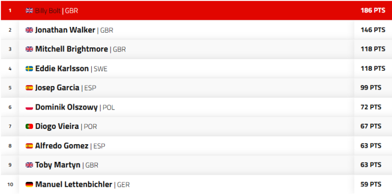 Jonny Walker fue el único capaz de seguir el ritmo del campeón, protagonizando intensos duelos en las tres mangas y asegurando un sólido segundo puesto general. Mitch Brightmore completó el podio con una actuación heroica, compitiendo con un hombro dislocado desde la mañana y aun así logrando dos terceros puestos que lo consolidaron entre los protagonistas de la noche.