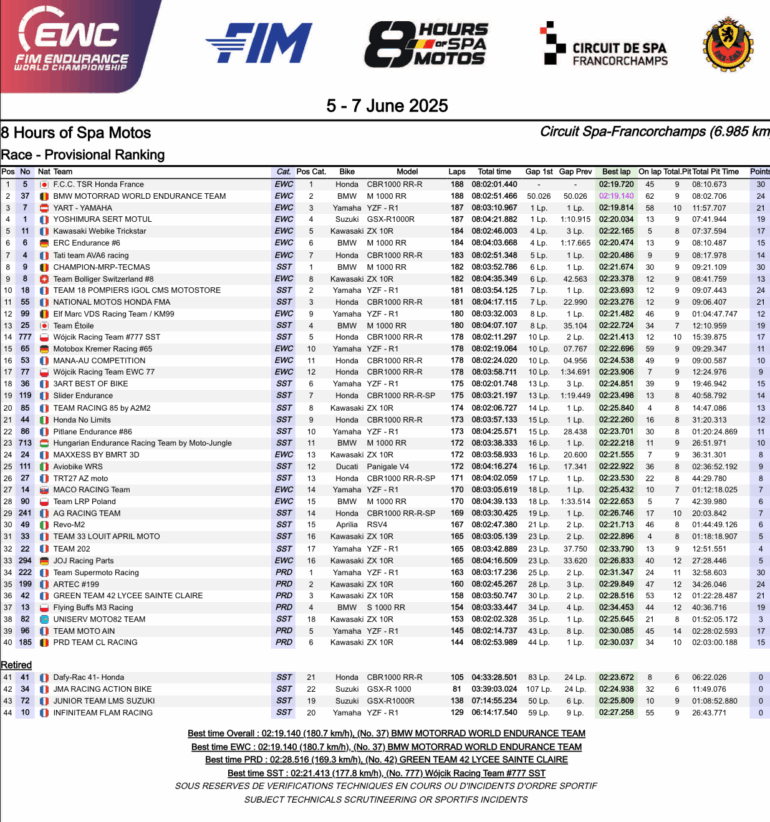 El F.C.C. TSR Honda Francia se alzó con la gloria en el Campeonato Mundial de Resistencia de la FIM gracias a la victoria conjunta de Corentin Perolari y Alan Techer en las 8 Horas de Spa Motos. Este resultado pone fin a una mala racha que se remonta a las 24 Horas de Le Mans en abril de 2023, tras una dramática carrera bajo la lluvia en el Circuito de Spa-Francorchamps.