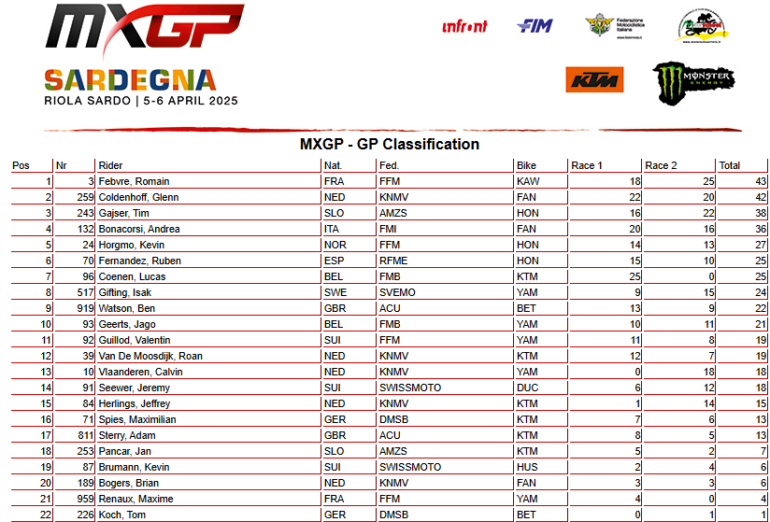 El circuito Crossodromo Communicale “Le Dune” en la isla de Cerdeña fue el anfitrión de una increíble cuarta fecha del Mundial FIM de Motocross. En MXGP, Romain Febvre (Kawasaki) se llevó la victoria general, en un domingo donde Lucas Coenen (KTM) empezó perfecto y terminó mal. En MX2, el campeón Kay de Wolf (Husqvarna) fue imbatible en Riola Sardo.