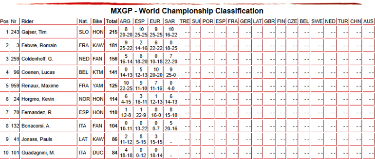 La clase MXGP vio una combinación de juventud y experiencia en la cima, empezando con el novato Lucas Coenen del KTM Factory Racing ganando la primera carrera. Sin embargo, en la primera curva de la segunda manga, el belga quedó fuera de combate y los veteranos sacaron chapa, con la figura del Kawasaki Racing, Romain Febvre, logrando su primera victoria en un GP desde agosto de 2023, con Glenn Coldenhoff celebrando el segundo lugar general con Fantic Factory Racing y completando, el líder del certamen Tim Gajser de Honda HRC.