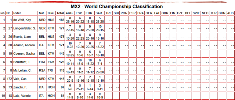 La clase MX2 fue otra poderosa pelea pero el actual campeón mundial, del Husqvarna Factory Racing, hizo todo mejor. Kay de Wolf obtuvo su segunda victoria de la temporada con un perfecto 1-1 y así reclamar la placa roja. Triumph Racing se llevó su primer trofeo de la temporada con Camden McLellan terminando segundo en la general por delante de Andrea Adamo, quien anotó de local su primer podio en Cerdeña con KTM Factory Racing.