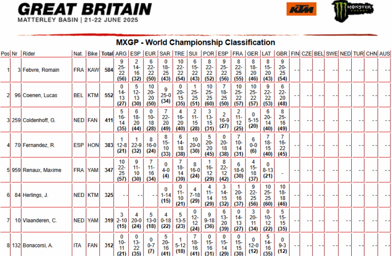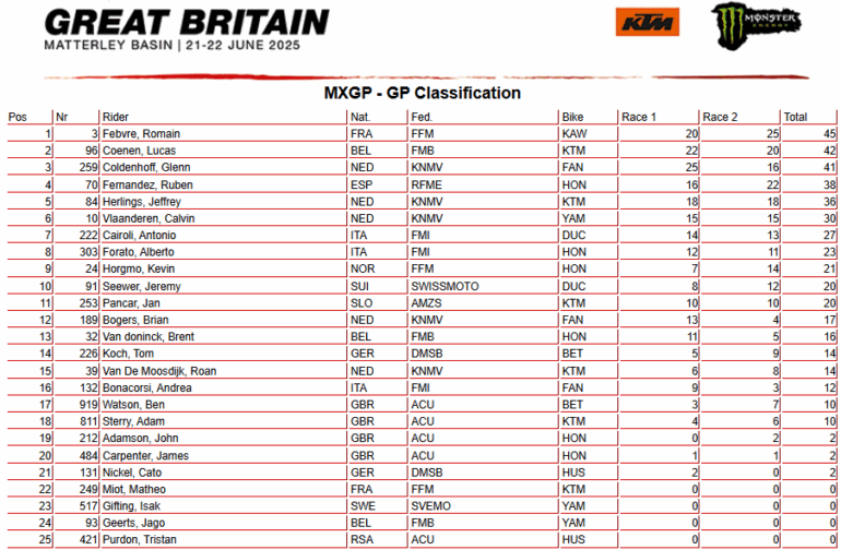 Con el tradicional sol británico escondido, las estrellas del MXGP iluminaron el Gran Premio de Gran Bretaña, la duodécima ronda del Campeonato Mundial de Motocross FIM 2025 en Matterley Basin. Con algo de sol por momentos, pero como complicación el fuerte viento, Romain Febvre (Kawasaki) dominó en MXGP para escapar en la cima mientras Simon Längenfelder (KTM) hizo lo propio en MX2 para afianzarse en la punta.