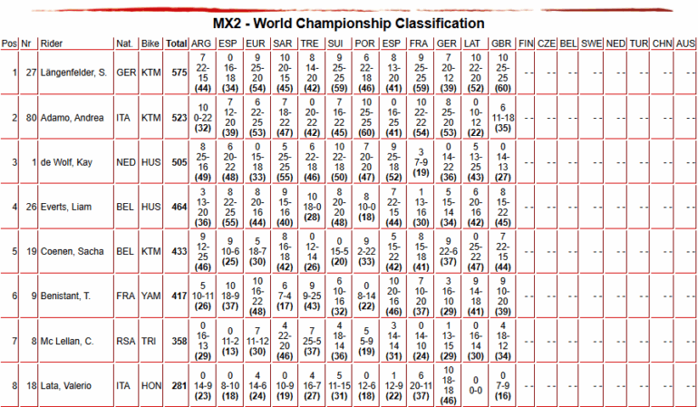 En la MX2, Simon Längenfelder (KTM) tuvo un fin de semana perfecto. Mostró paciencia para remontar en la primera manga antes de conseguir una victoria de principio a fin en la segunda. Liam Everts (Husqvarna) logró su mejor resultado en mucho tiempo, alcanzando el segundo puesto general. Su compañero de equipo, Sacha Coenen (Husqvarna), se ubicó en tercer lugar.