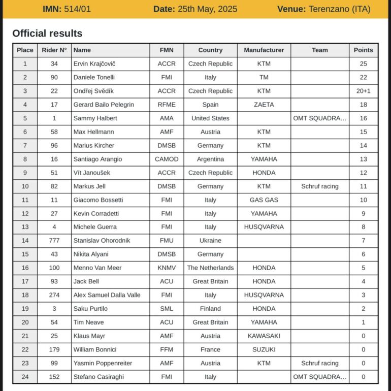 Ervin se impuso tras una final neutralizada por roja tras las caídas del español Gerard Bailo y el italiano Kevin Corradetti. El italiano Daniele Tonelli y otro checo, Ondřej Svědík, se alzaron con el podio en P2 y P3. El vigente campeón, el norteamericano Sammy Halbert, tuvo una penalización en la largada y tras remontar, terminó quinto.
