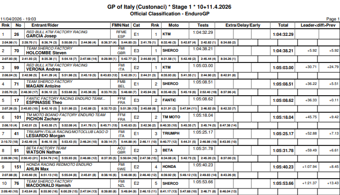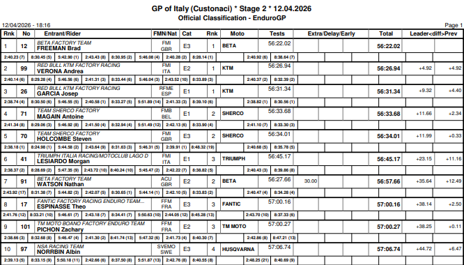 El segundo día del EnduroGP de Italia 2026 devolvió a Steve Holcombe y Brad Freeman a los primeros planos, liderando la clasificación tras la primera vuelta y demostrando que siguen plenamente competitivos pese a las lesiones del año anterior. Holcombe tomó la delantera desde el inicio, con Freeman muy cerca y el italiano Morgan Lesiardo alimentando el entusiasmo local al situarse por delante del ganador del sábado, Josep García. Aunque cada especial resultó decisiva, el largo Enduro Test volvió a marcar diferencias, aunque mínimas: Nathan Watson fue el más rápido, apenas por delante de Freeman y Holcombe, todos comprimidos en menos de un segundo en la segunda vuelta.