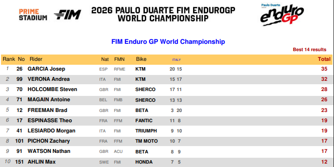 Con expectativas renovadas, el Mundial de EnduroGP arrancó con muy buena competitividad en terrenos italianos. Sicilia recibió la apertura del calendario 2026 donde distintas marcas dejaron su huella, pero KTM se terminó llevando el mayor premio. Sin embargo, Beta concluyó el domingo con el triunfo en la Etapa 2 por parte de Brad Freeman. Josep García ganó la Etapa 1 con KTM y lidera el certamen con el italiano Andrea Verona, ahora también con KTM, como escolta.