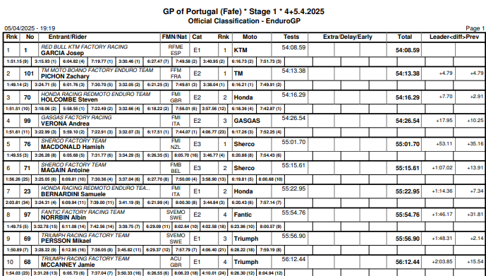El Mundial de EnduroGP arrancó con gran variedad de protagonistas en la batalla por triunfar y por el podio. La cita portuguesa inició con pocas sorpresas, ya que García venció y si bien Pichon fue muy rápido, no le alcanzó para impactar tanto como lo haría al día siguiente. Steve Holcombe (Honda) fue tercero en la Etapa 1.
