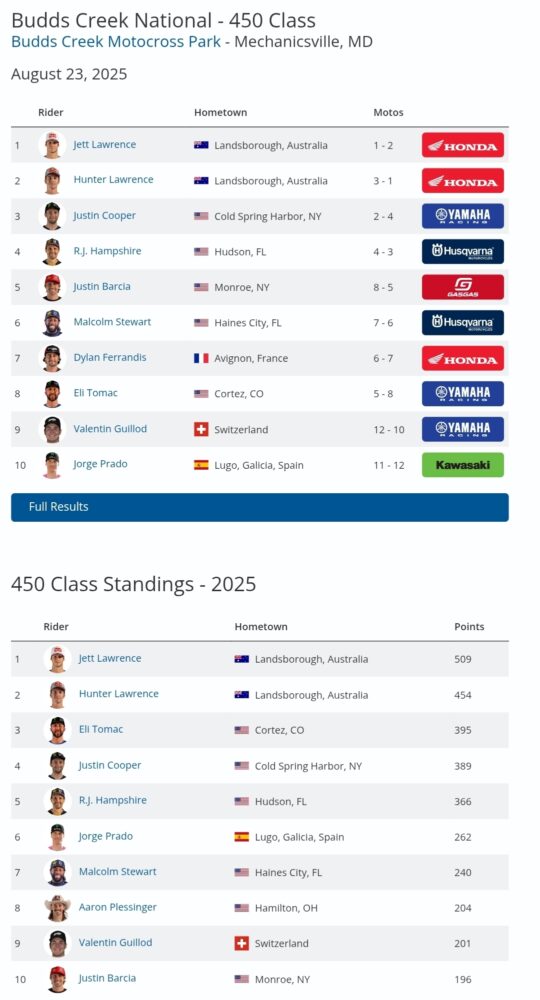 El resto del top 5 de la clase 450 fue una batalla cerrada. Jett Lawrence ya había asegurado el título en la ronda anterior, pero su enfoque en la victoria final en Budds Creek subraya su mentalidad competitiva. Hunter Lawrence, por su parte, se aseguró el segundo puesto en la clasificación final de la temporada, consolidando el dominio de Honda en la categoría reina.