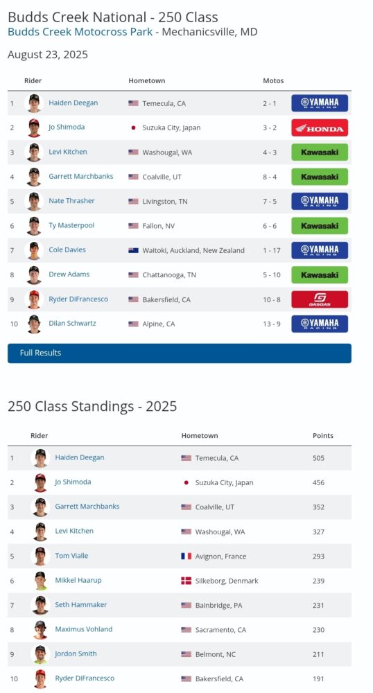 El dominio de Deegan fue contundente a lo largo de la temporada. Su actuación en Budds Creek, con un 2-1 en las mangas, le permitió no solo celebrar el campeonato en lo más alto del podio, sino también consolidar su legado en la categoría. Jo Shimoda, de Honda, terminó la temporada como subcampeón, mientras que Garrett Marchbanks de Pro Circuit Kawasaki, se quedó con el tercer lugar en la clasificación general del campeonato.