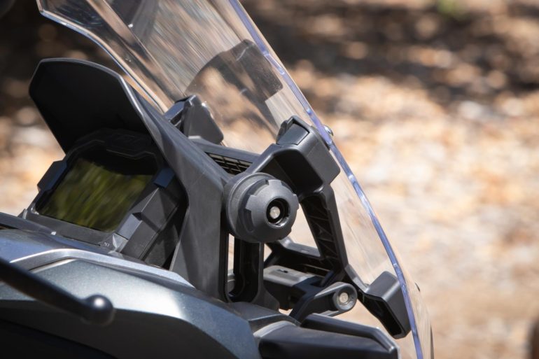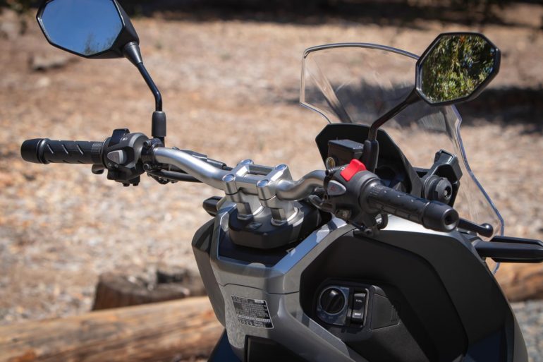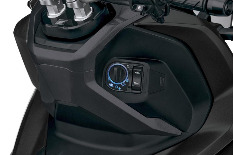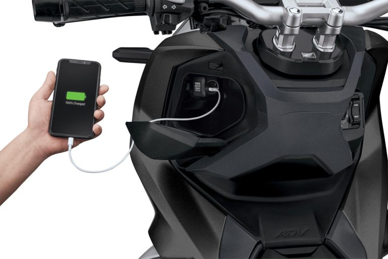 Como todo scooter que se precie, el ADV150 tiene cuenta con una guantera del lado interno del carenado, donde también podemos encontrar una toma de 12 voltios, y un baúl debajo del asiento, donde cabe un casco.