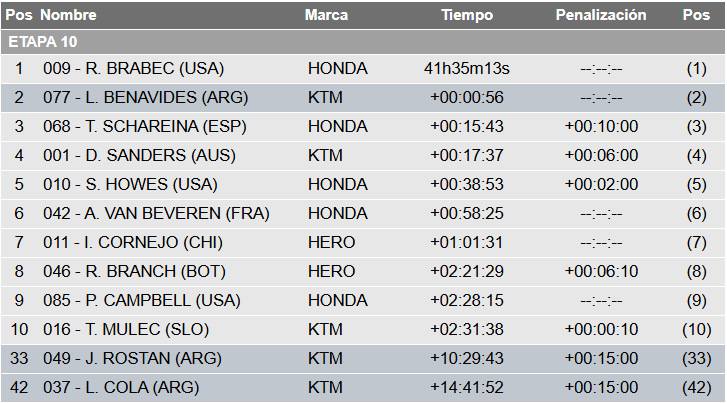 Los problemas para Sanders son importantes porque un accidente le generó fracturas y podría tener que abandonar. El australiano, ahora es cuarto a más de 17 minutos, pero físicamente no está bien. Tercero es Tosha Schareina (Honda) a un cuarto de hora aproximadamente, y por lo tanto, la carrera parece tener en las próximas tres etapas, una definición entre Ricky Brabec y Luciano Benavides. Brabec quiere su tercer Dakar, Benavides el primero para él y tercero para la familia; uno con Honda, el otro con KTM.