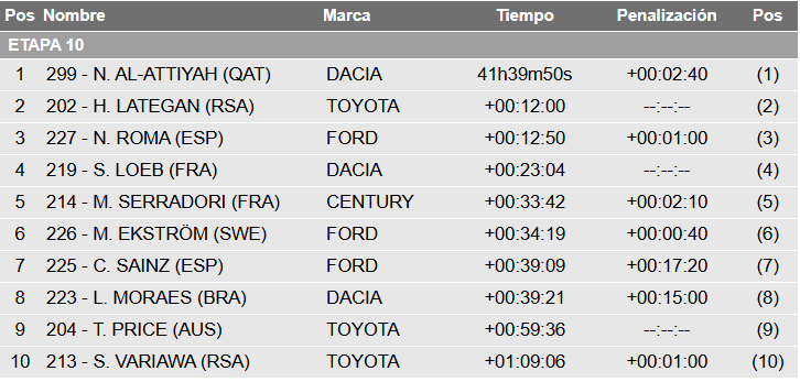 Pasando a los Autos, la increíble etapa de ayer cambió totalmente de rumbo con Mathieu Serradori (Century) ganando la especial, quedando por delante del tridente de Dacia: Nasser Al Attiyah (Dacia) retomó la punta de la general y por doce minutos, mientras que Henk Lategan (Toyota) es el escolta. Nani Roma (Ford) cayó al tercer lugar, 50 segundos detrás de Lategan, y las tres marcas aún sueñan con ganar el Dakar 2026. Sébastien Loeb (Dacia), perdió tiempo pero está cuarto en la carrera a 23 minutos. Mattias Ekström (Ford) y Carlos Sainz (Ford) perdieron tiempo valioso que los saca prácticamente de la pelea, mientras que Serradori subió al quinto lugar.