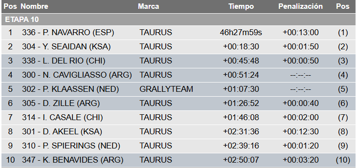 Bruno Jacomy sigue siendo el mejor argentino ubicado, tercero navegando a Lucas del Río (Taurus), pero Cavigliasso y Pertegarini están pocos minutos y quieren ir por el podio. Augusto Sanz junto a la piloto Puck Klaassen (KTM), está quinto, delante de David Zille y Sebastián Cesana (Taurus), quienes perdieron un par de lugares hoy. Benavides y Sisterna, lograron entrar al Top 10, luego de varios días con el ritmo de punta.
