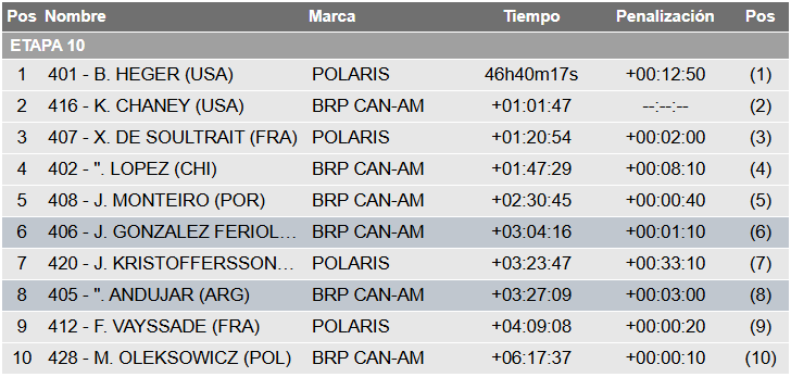 Dentro de los SSV, Brock Heger (Polaris) venció para escapar un poco más adelante en la general, y los argentinos Jeremías González Ferioli y Gonzao Rinaldi (Can-Am) fueron terceros. Esta dupla ahora subió al sexto lugar, mientras que Manuel Andújar y Andrés Frini (Can-Am) bajaron al octavo puesto.