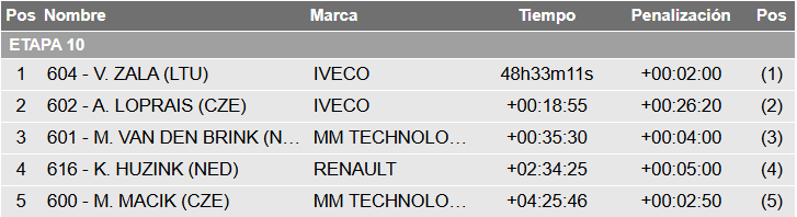 Completando, en Camiones hubo un tremendo golpe de escena por una rotura que le hizo perder más de una hora al líder Mitchel Van Den Brink (Iveco), y ahora está a más de media hora del ganador del día y nuevo puntero, Vaidotas Zala (Iveco), quien puntea con Ales Loprais (Iveco) segundo a casi 19 minutos; increíble jornada en los pesos pesados.